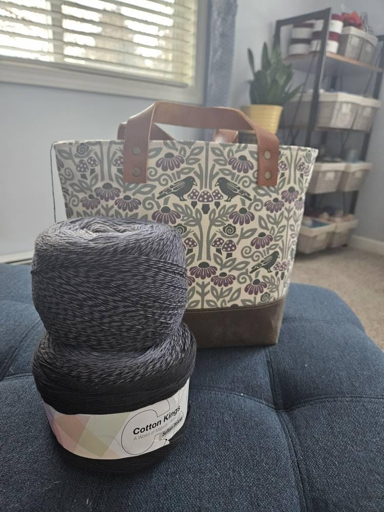 I love this bag, and the gussetted bottom is perfect to fit the size yarn cakes I tend to work with. This bag will fit 4 cakes of Hobbii Sultan Deluxe, which are 1k of sport weight yarn each.