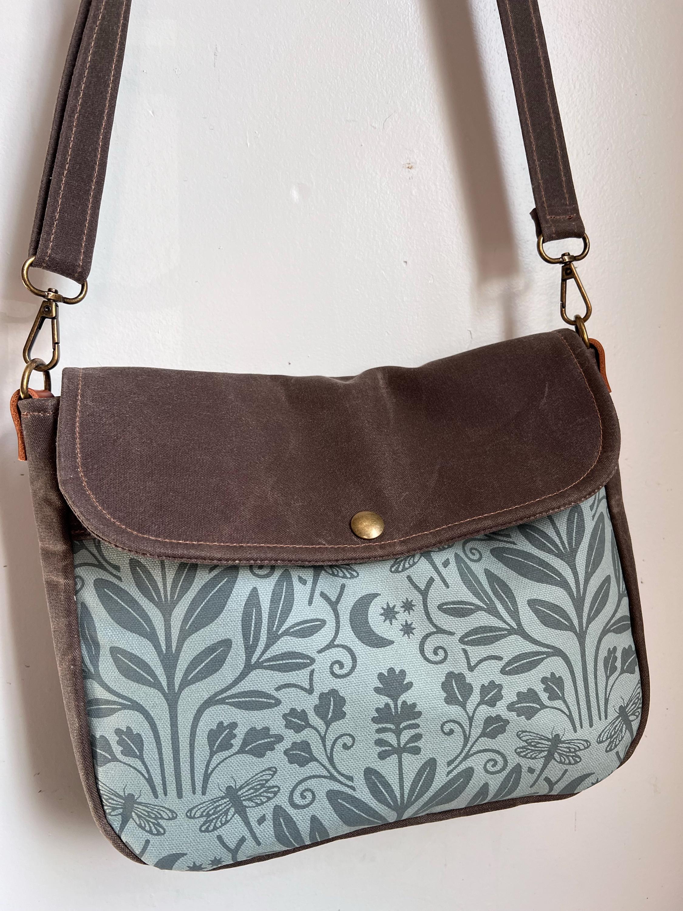 I created the bag design, designed the front panel fabric, screen printed the fabric panel and then sewed it all together in Portland, Oregon.