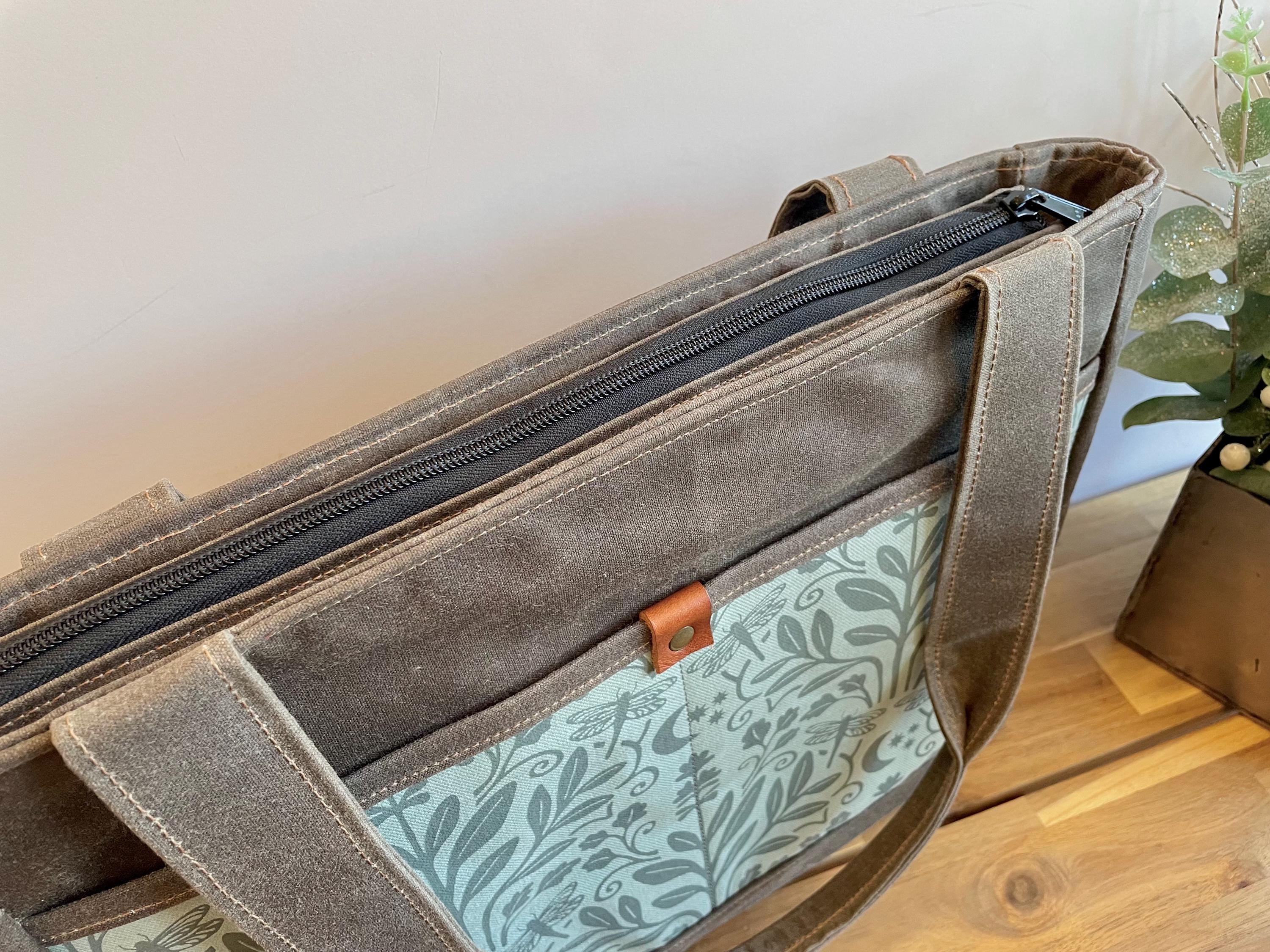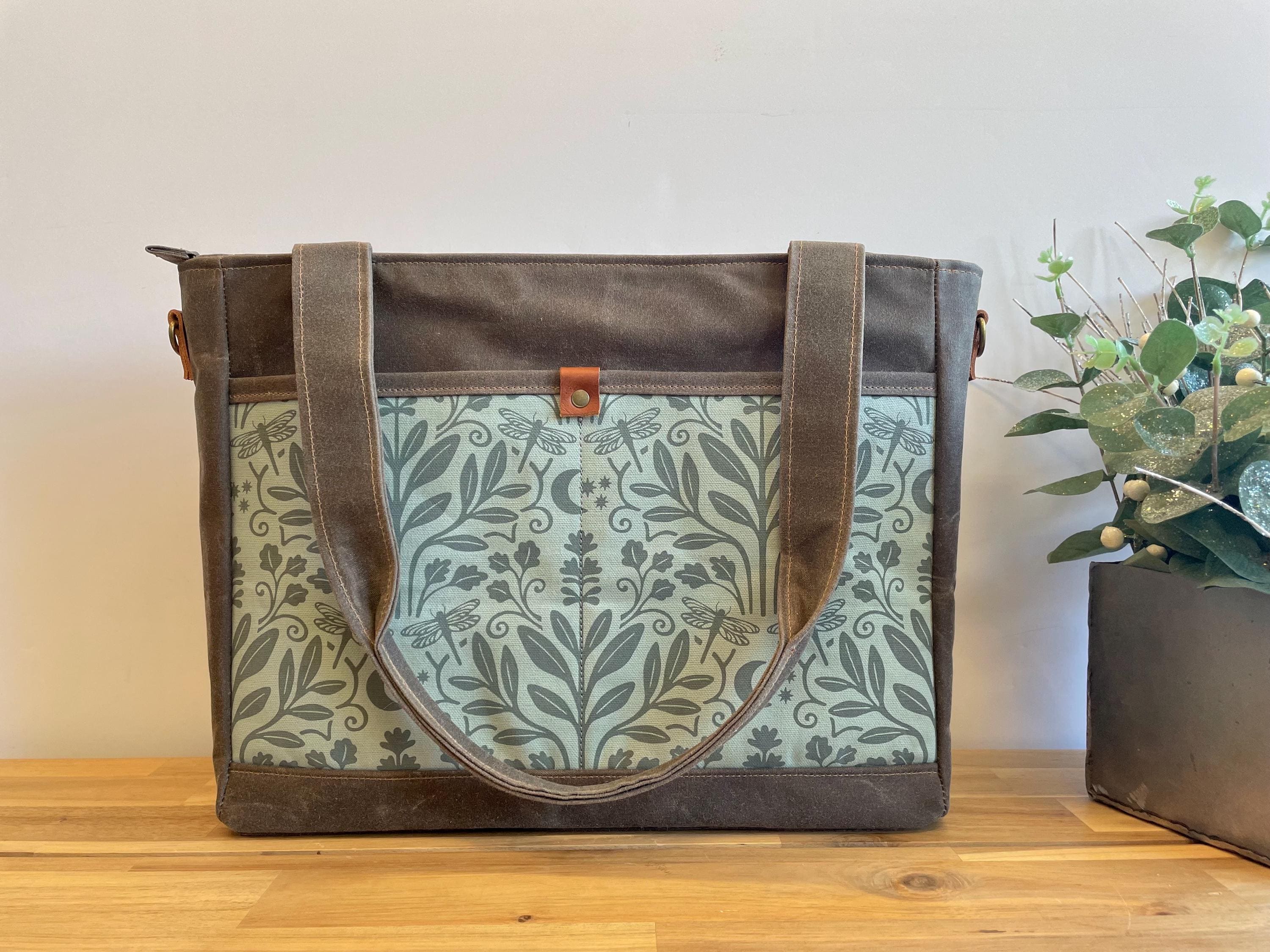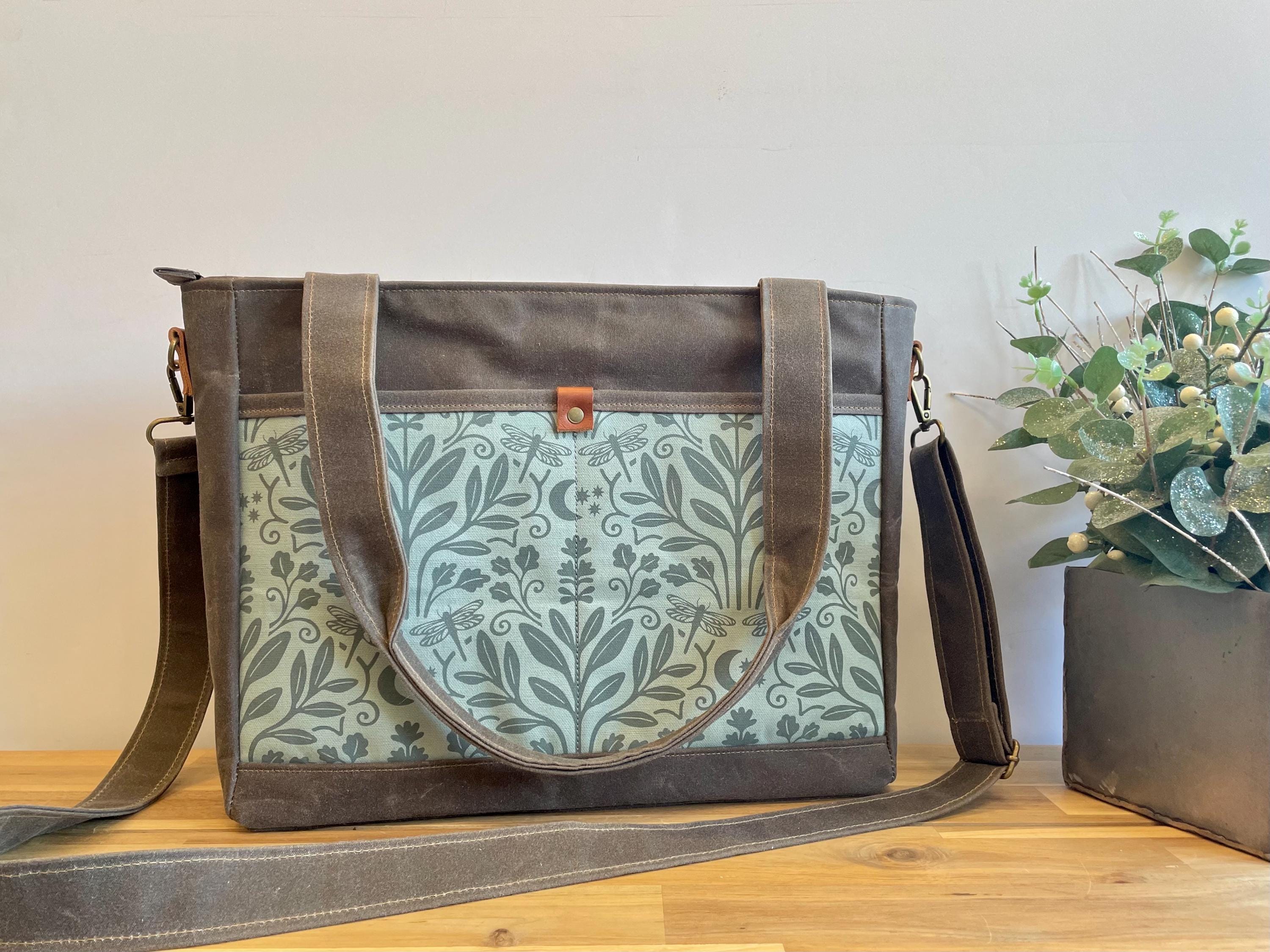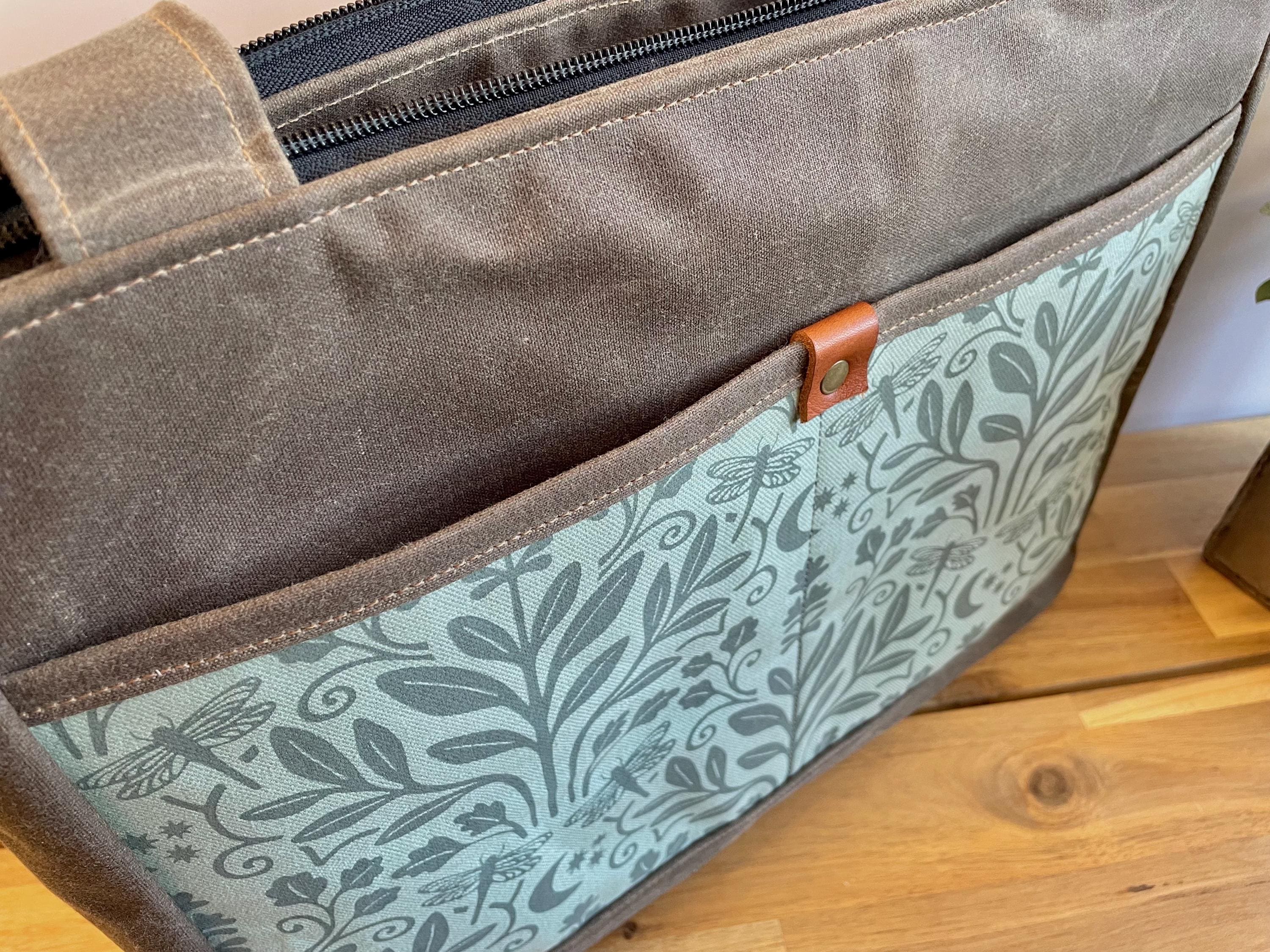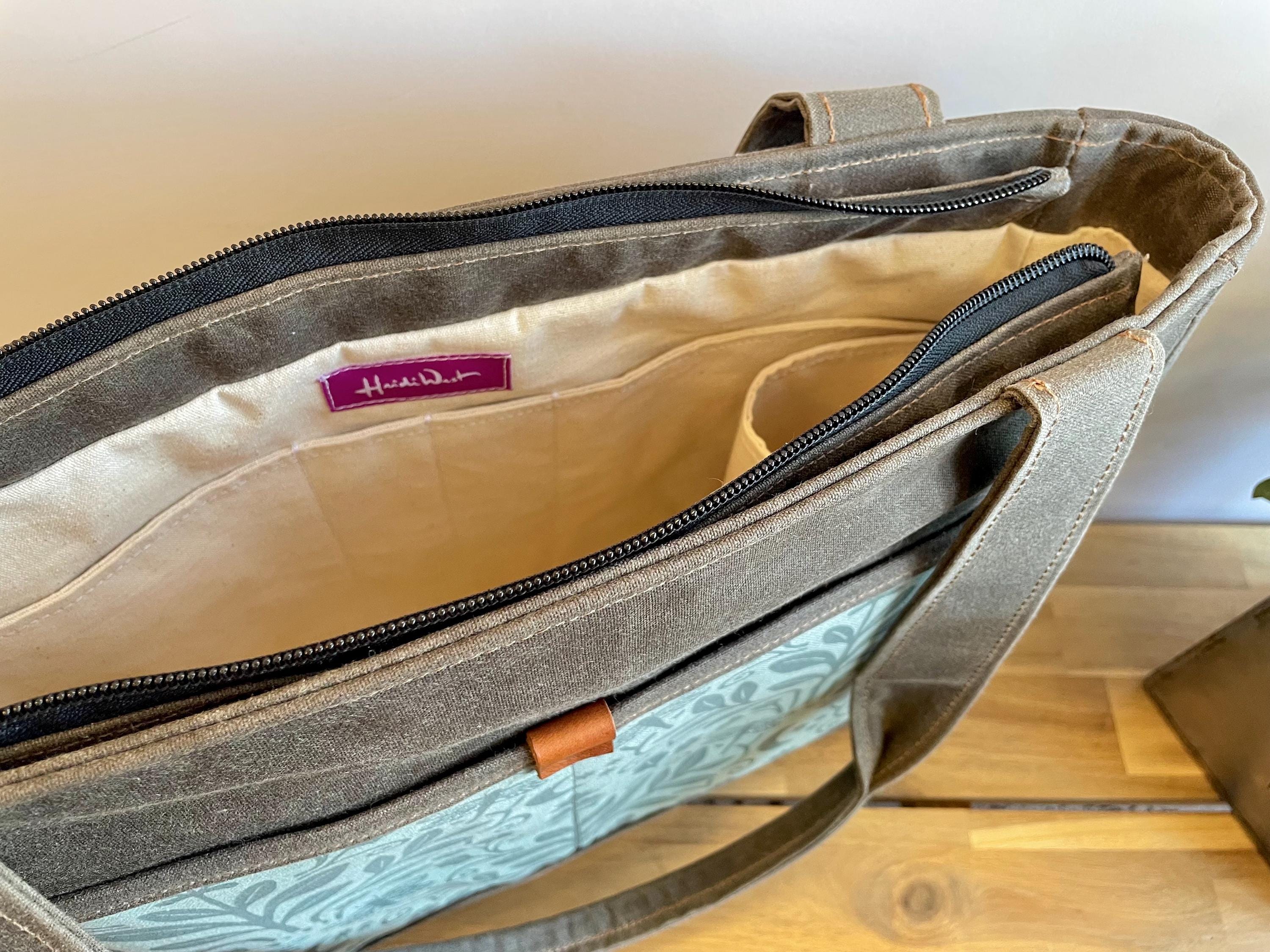 I created the bag design, designed the front panel fabric, screen printed the fabric panel and then sewed it all together in Portland, Oregon.