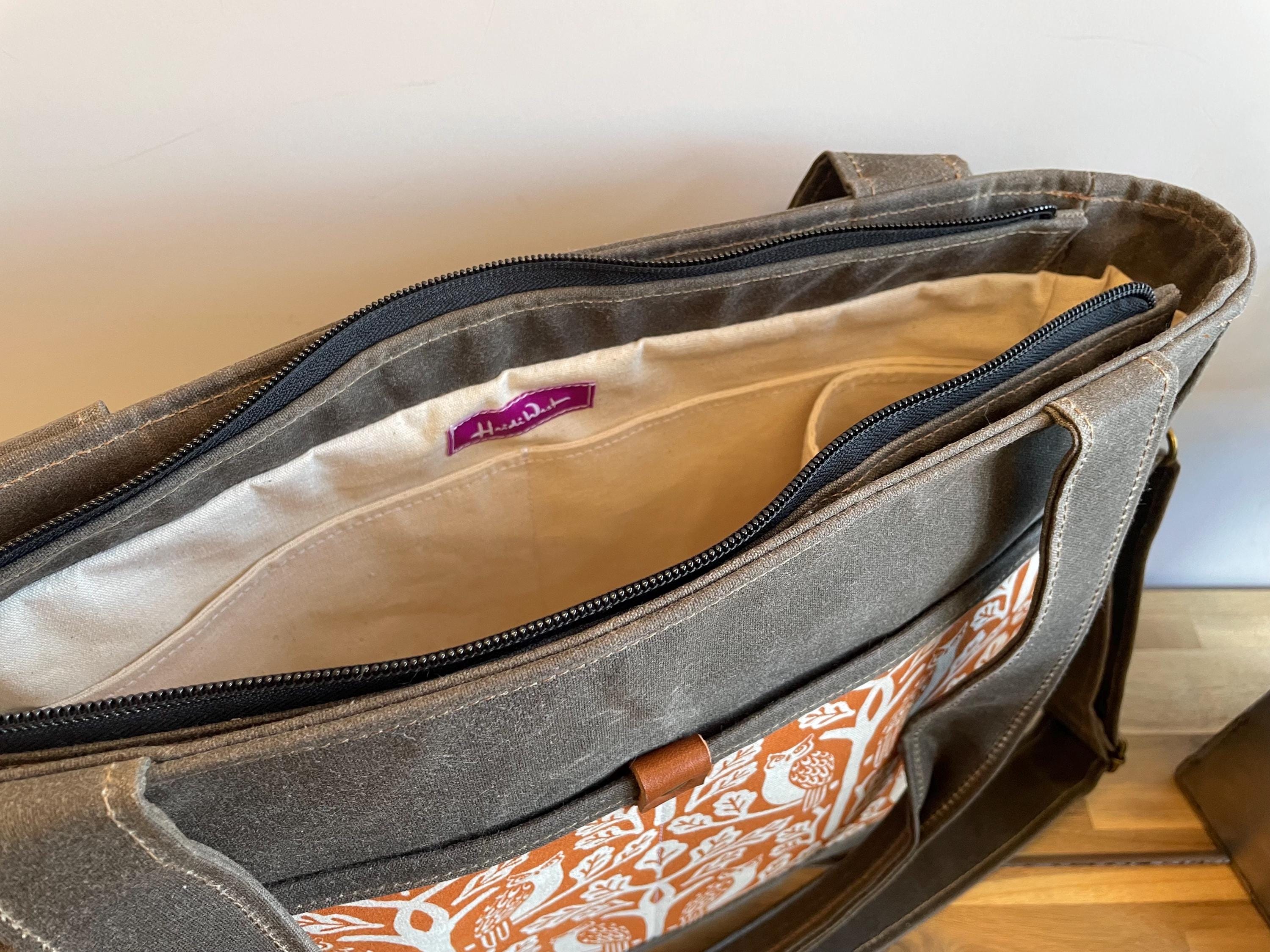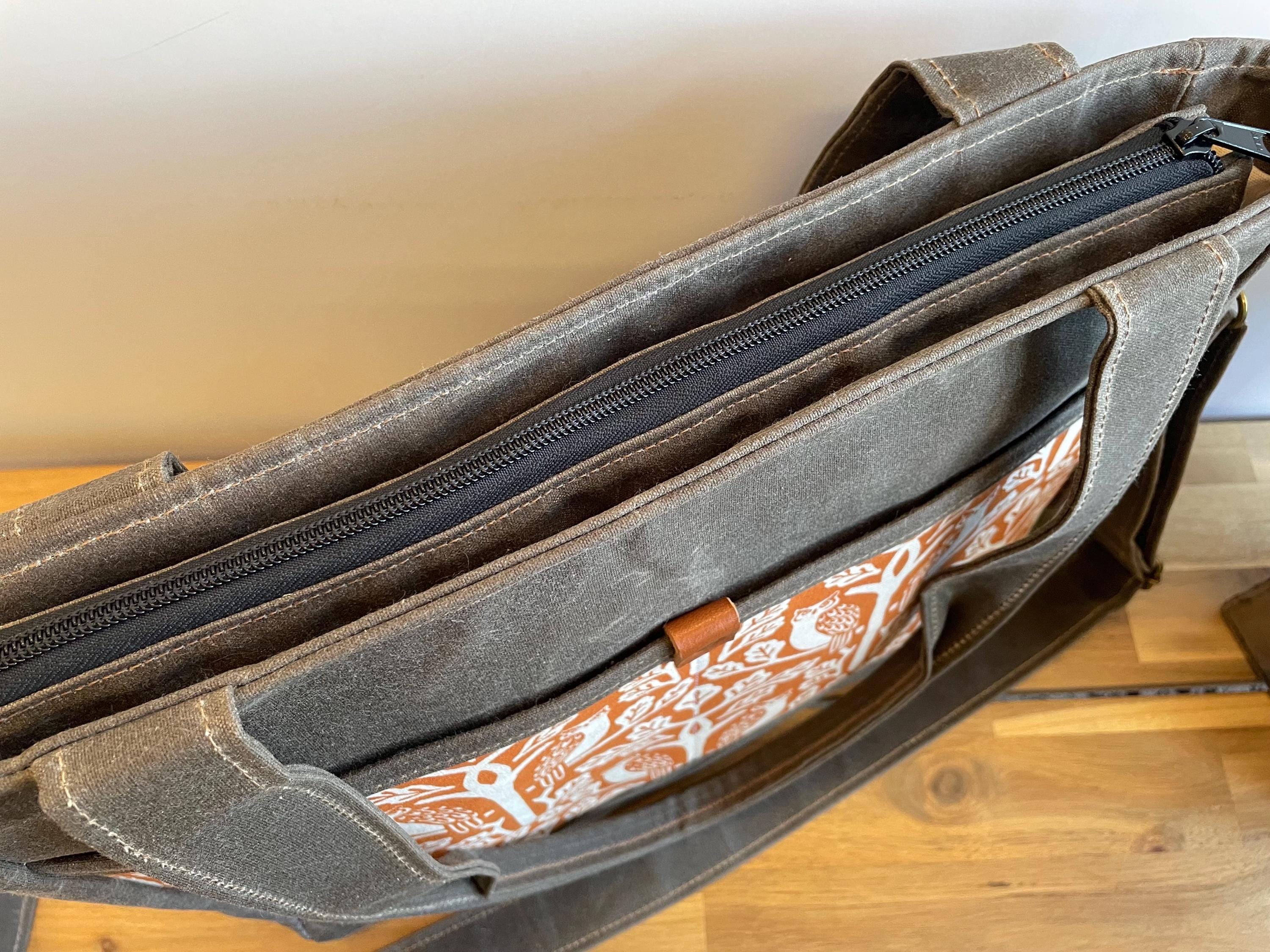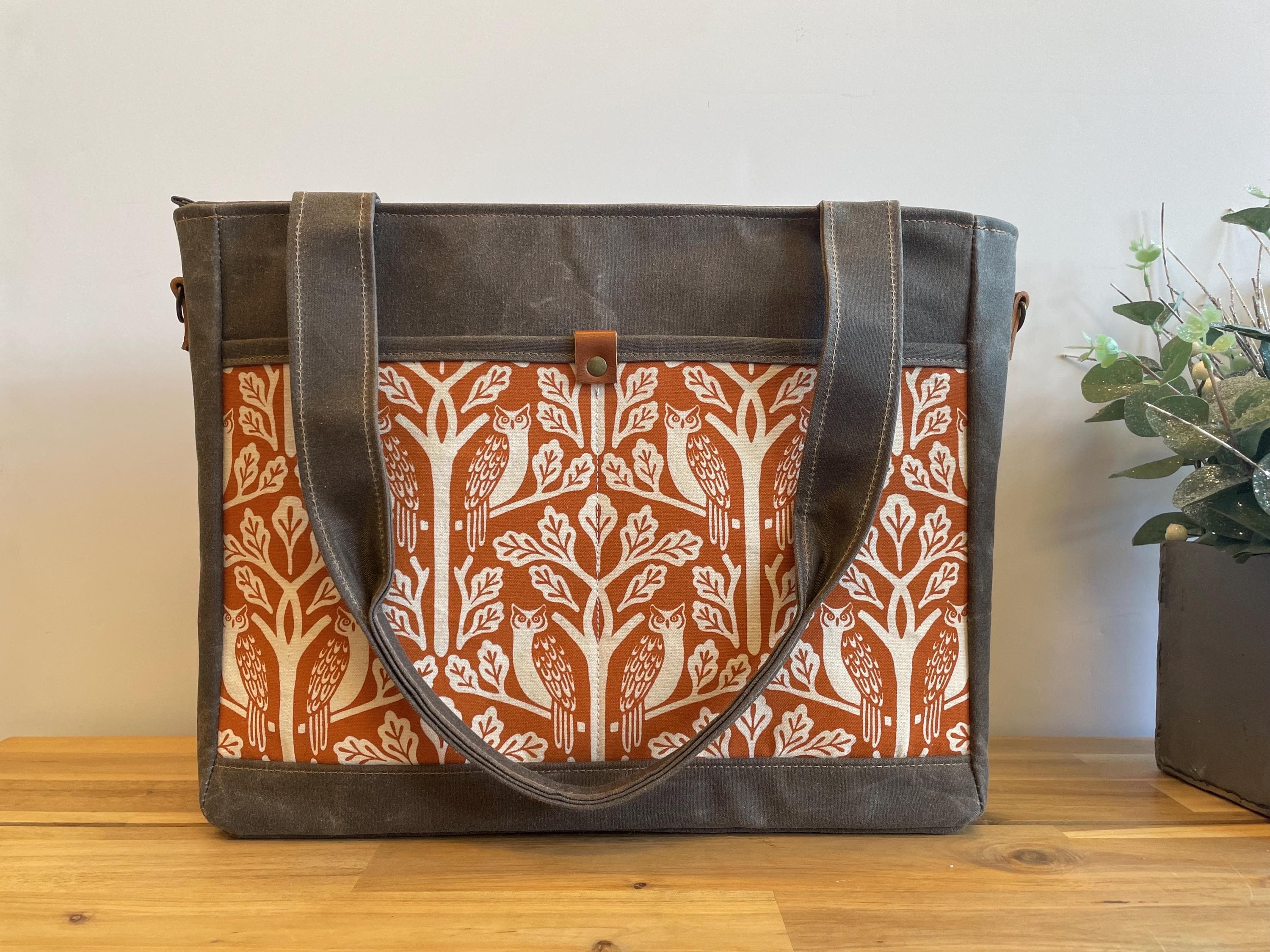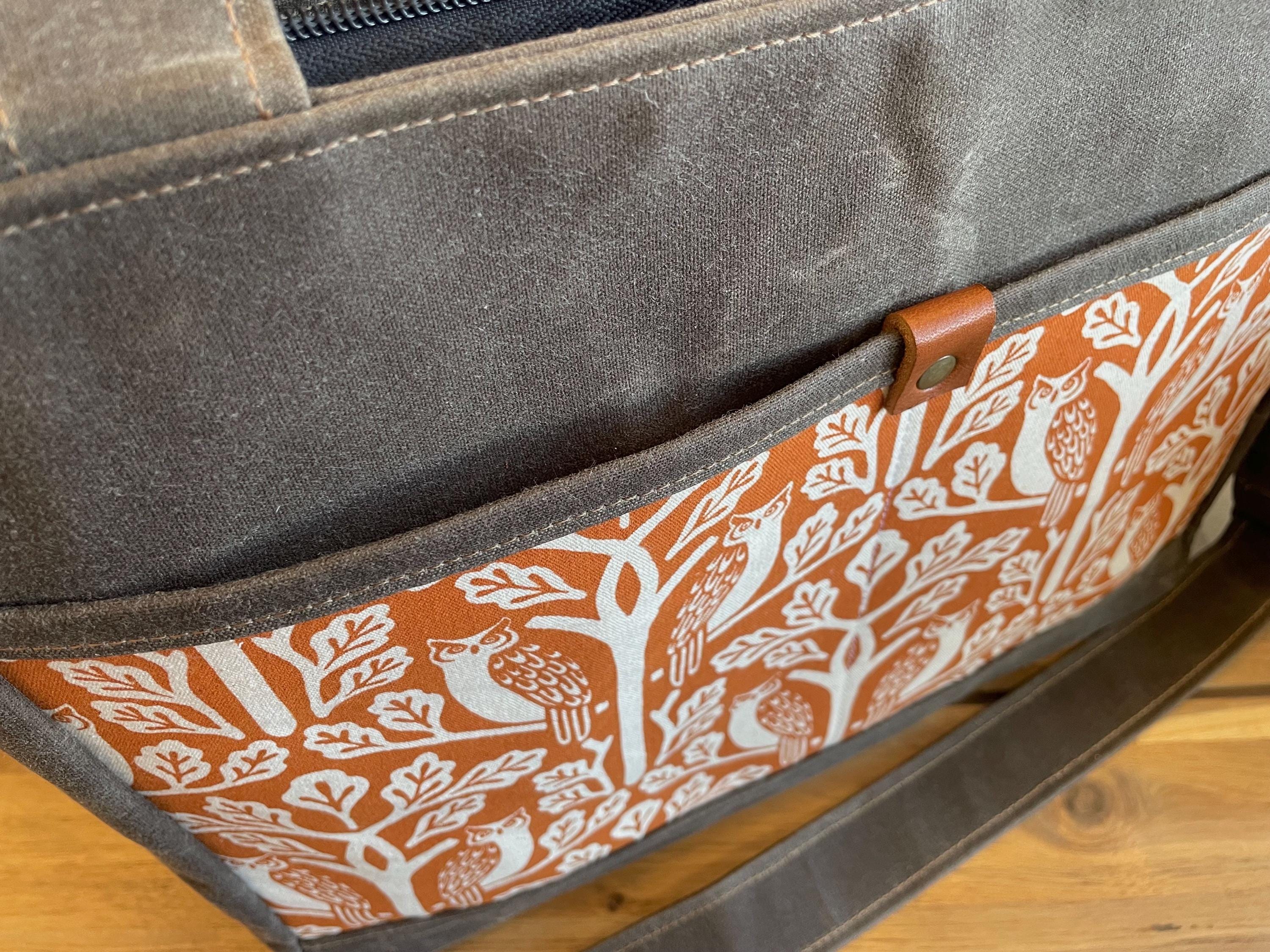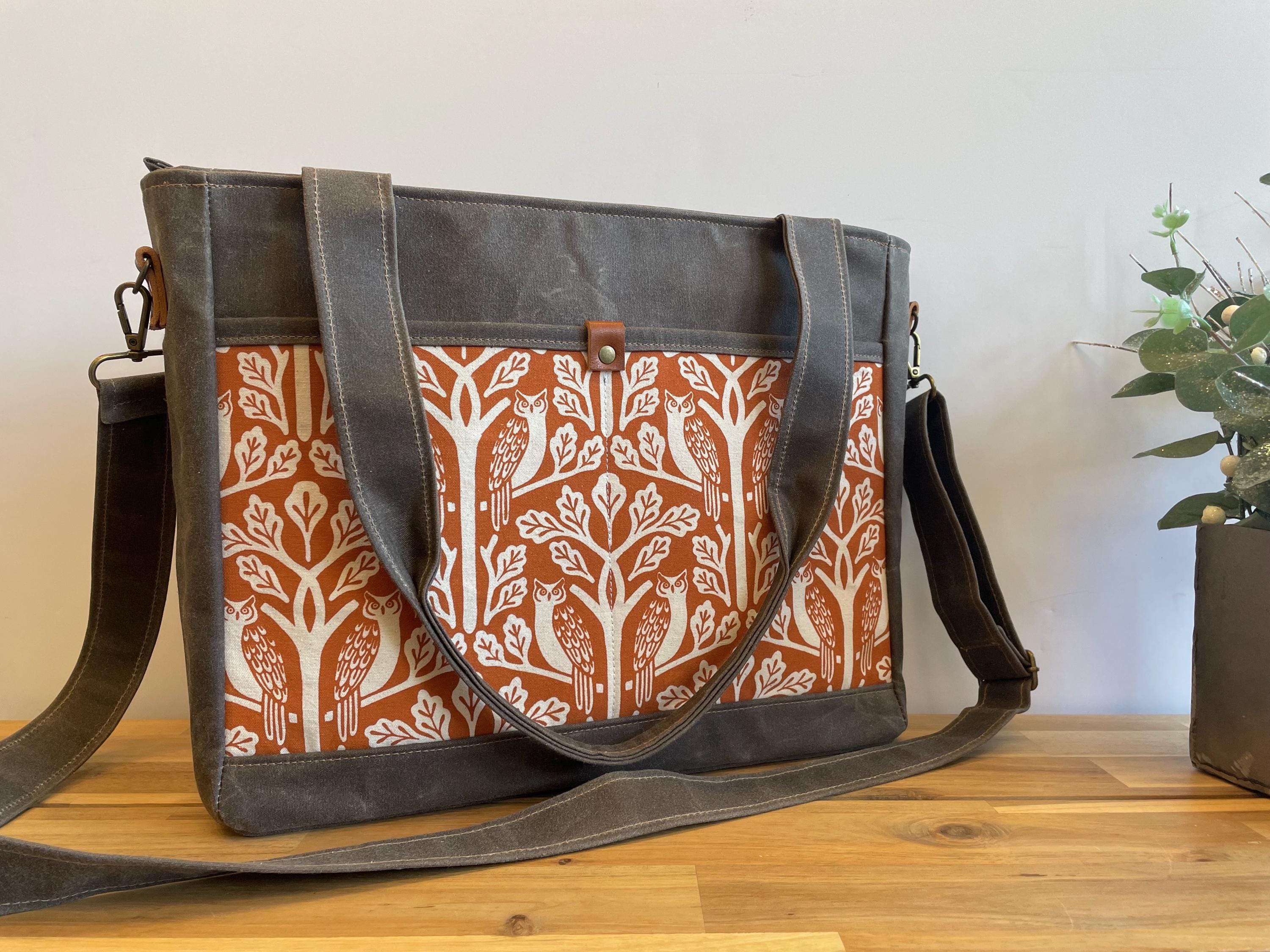 Waxed Canvas Knitting Laptop Bag: Orange Owl and Oak Tree Print